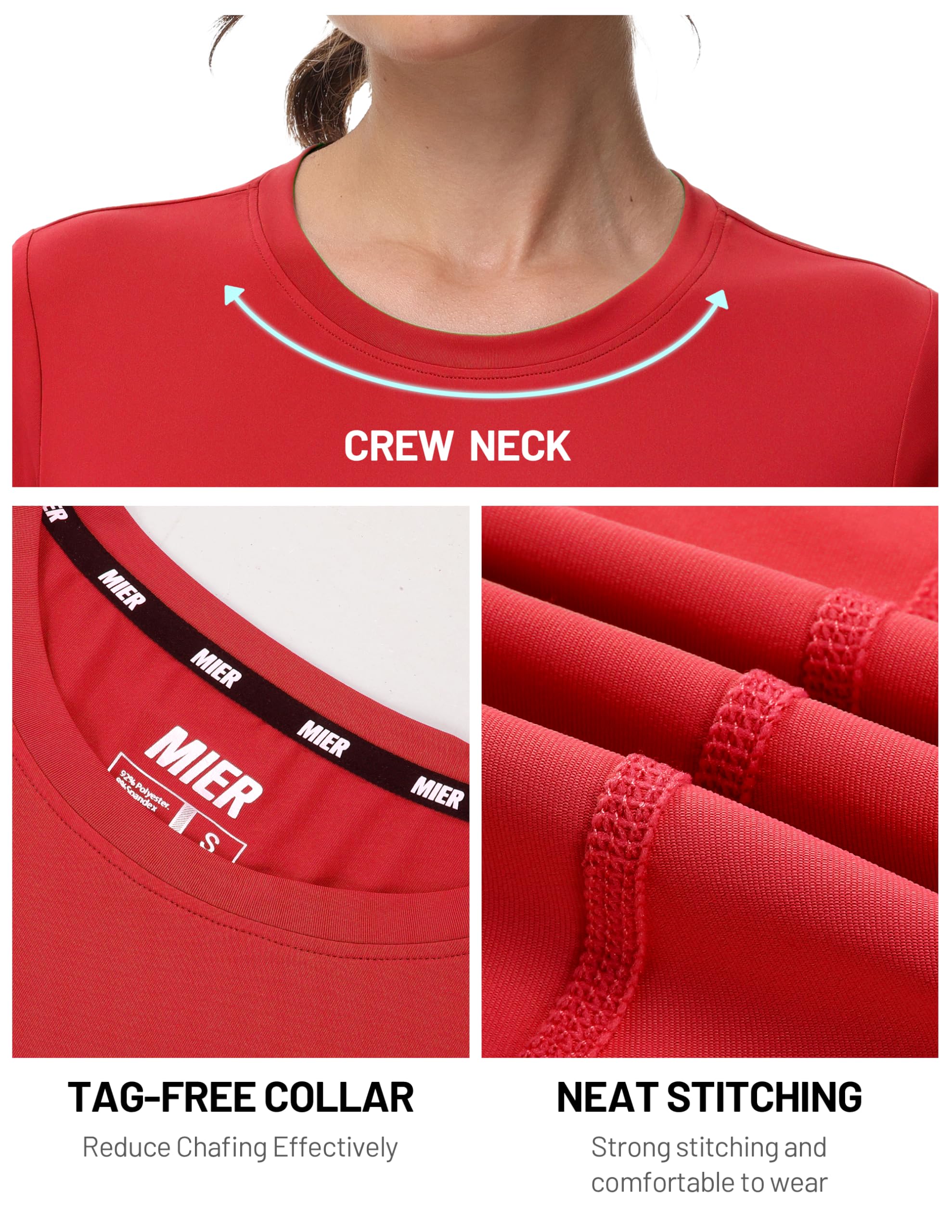 - Ultra Soft Fabric --- MIER Women's Athletic T-Shirts are made from a quick drying and 4-way stretch fabric with excellent moisture wicking and breathability properties. The material is lightweight and not see-through, ensuring you a comfortable exercise experience